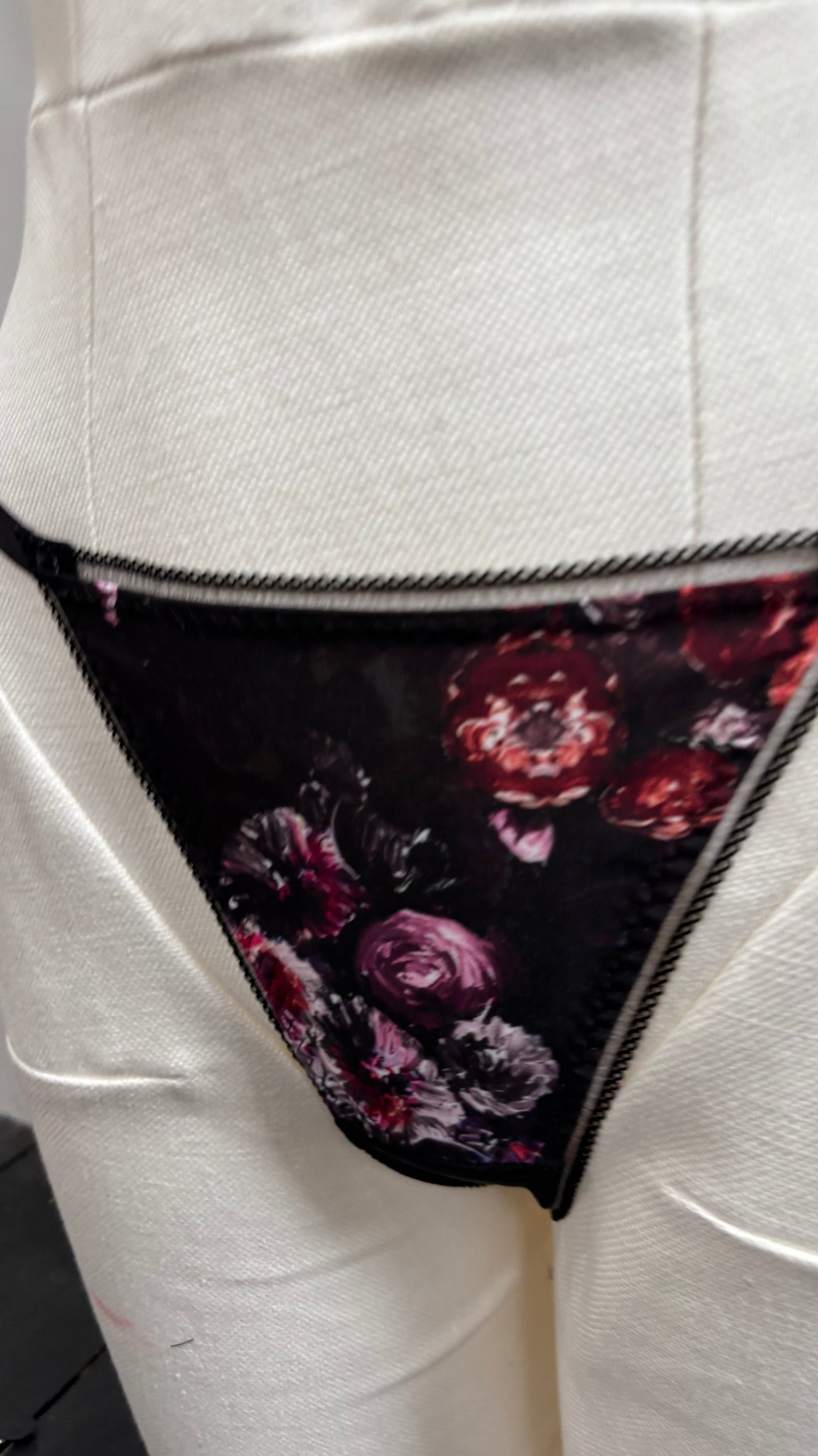 A bra, suspender belt and thong made from strong but sheer powermesh, and remnant print poly fabric - I am unable to confirm the exact make up of this printed fabric. Silver findings.