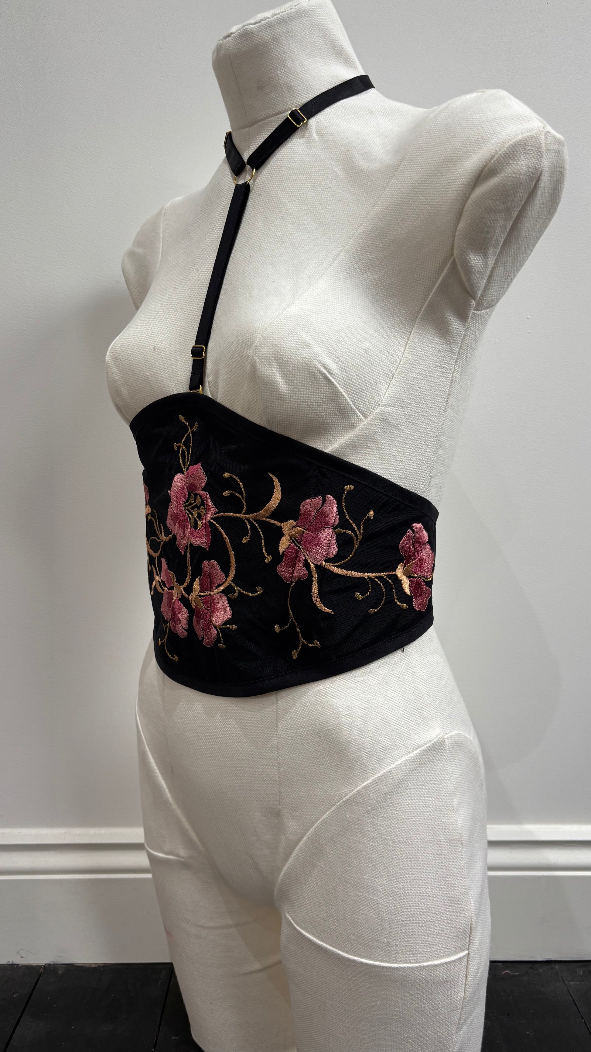 Coutil and Mesh soft boned harness with embroidered pink and gold florals.