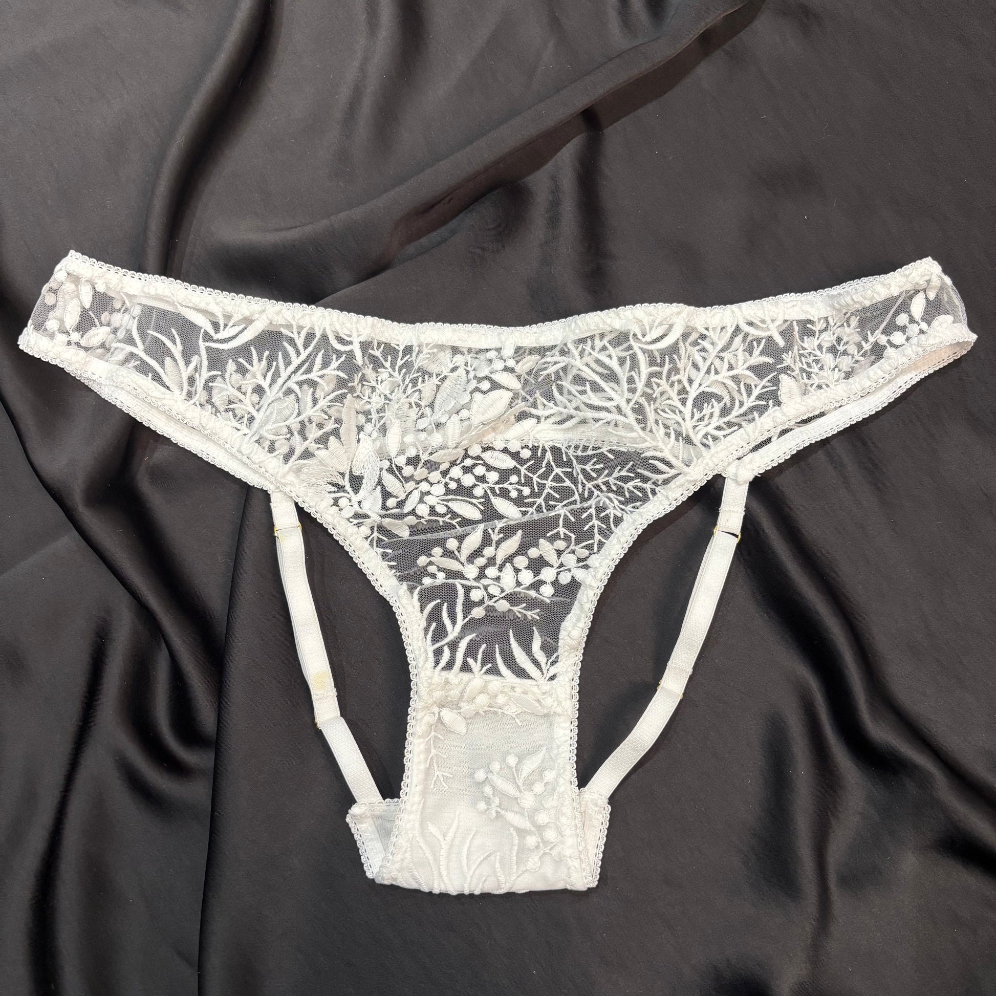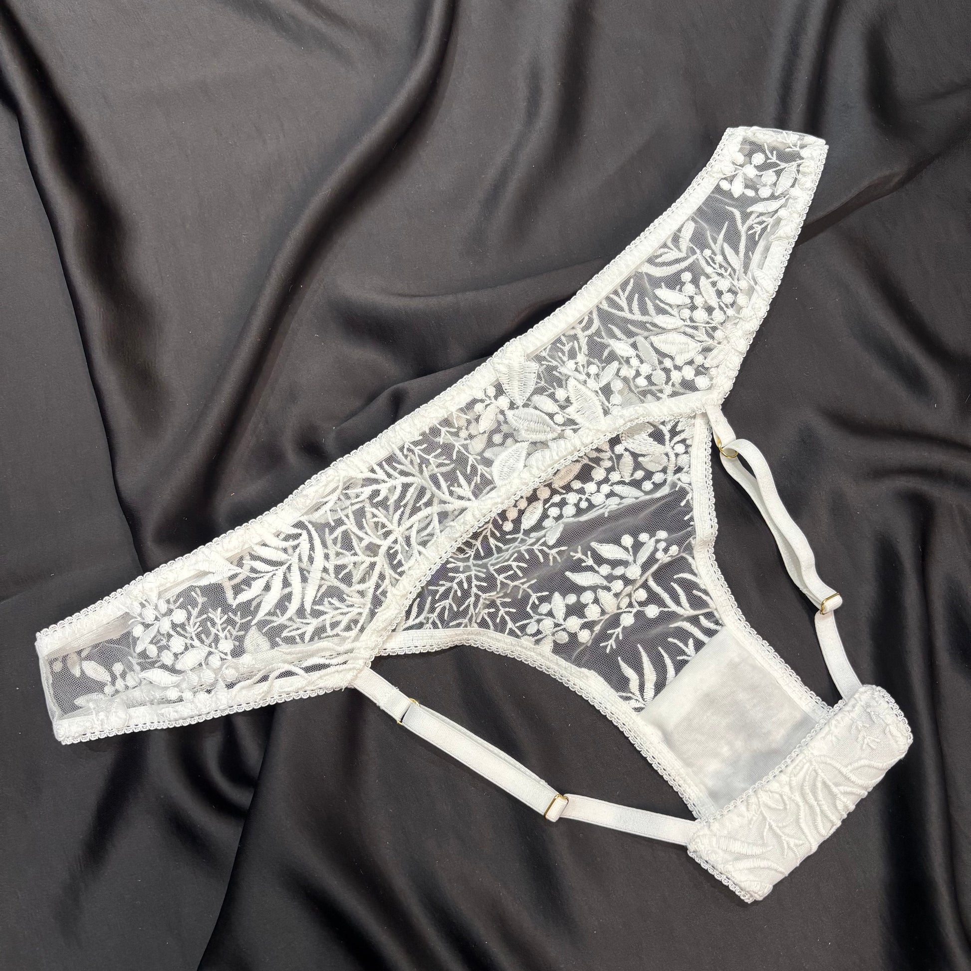 Hitch #4 is an embroidered tulle backless knicker with adjustable elastic straps at the back. Fits size 12 best.