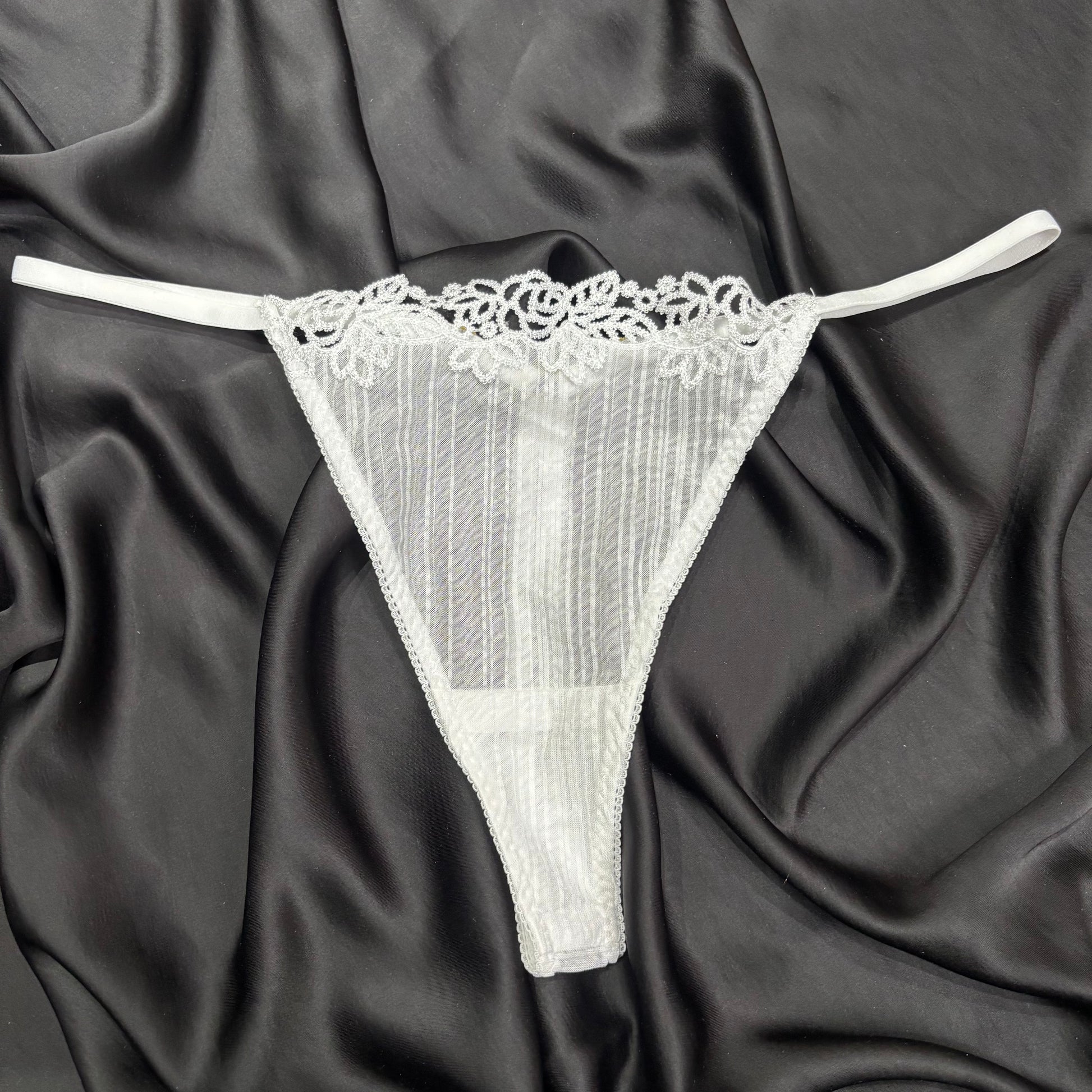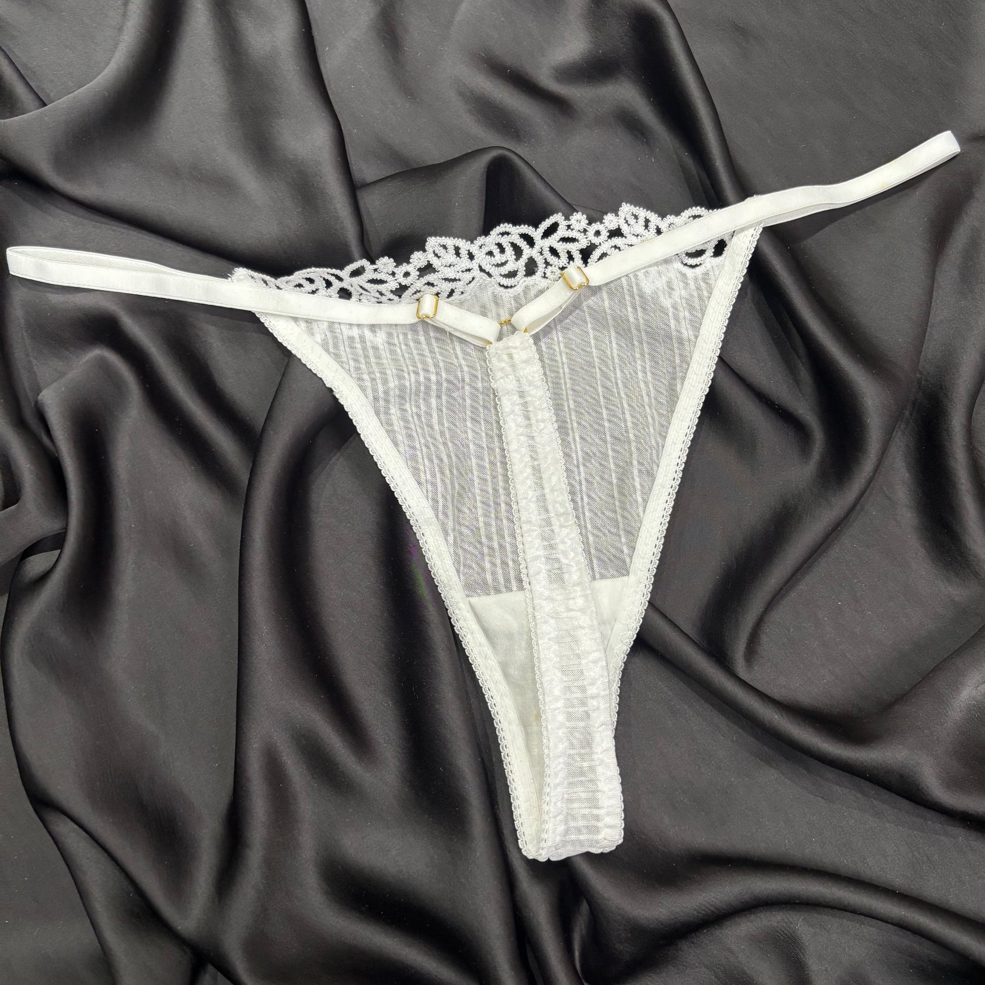 Hitch #7 is a strappy thong with cut out lace edge. Fits size 14 best.