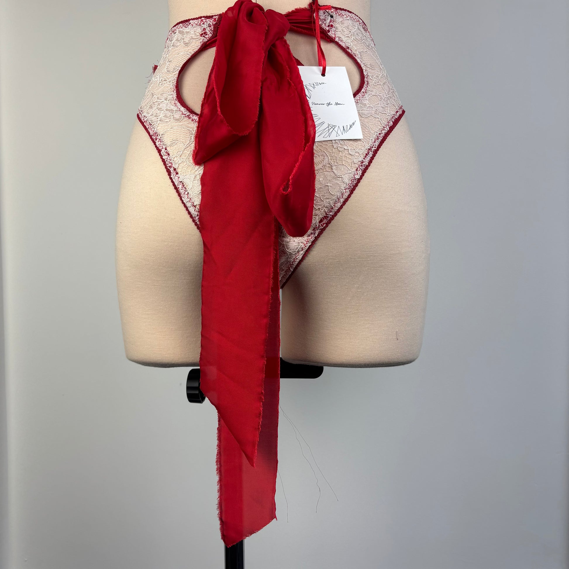 Palest Creamy Pink Lace turned into a high waisted knicker with big peephole and oversized raw edge bow to fasten at the back. Edged in gorgeous red picot elastic.