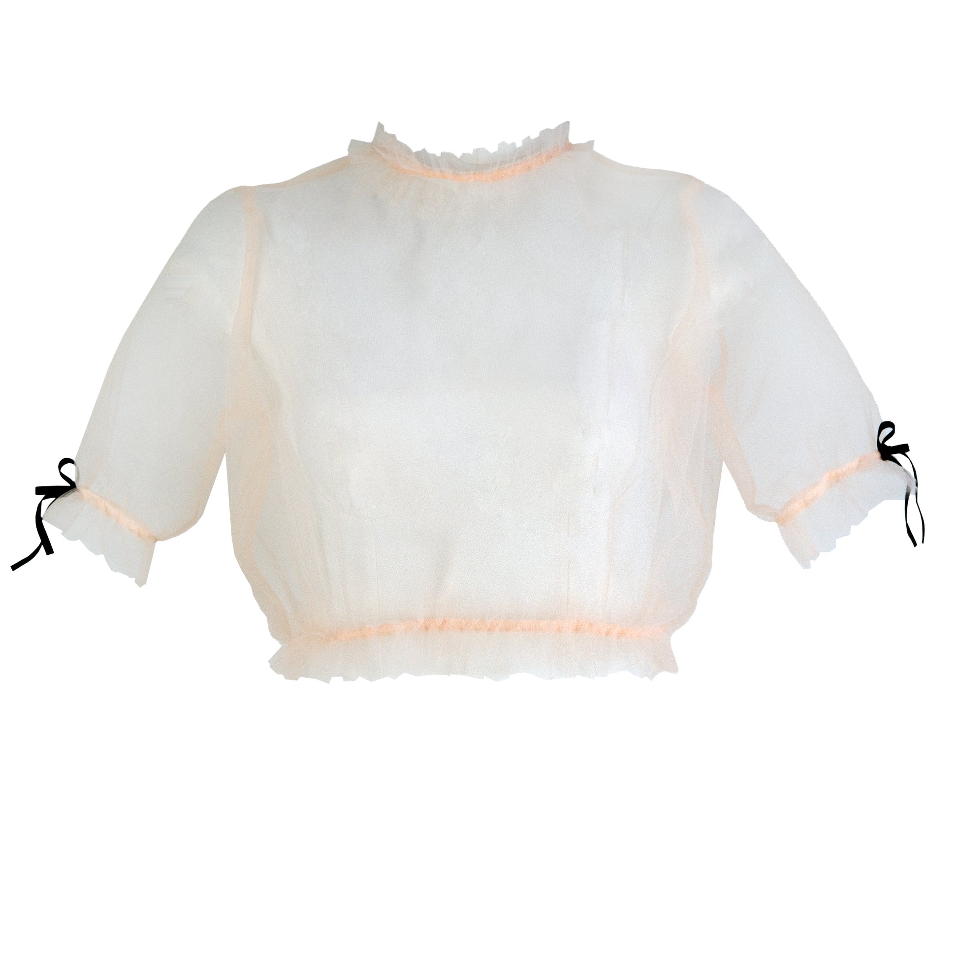 This barely there top can be worn under or over all of your favourite lingerie pieces to bring a little frou frou to any outfit. Made from a double layer of tulle, ruffles trim this blouse at arms, neckline and hem with tiny velvet bows to finish.